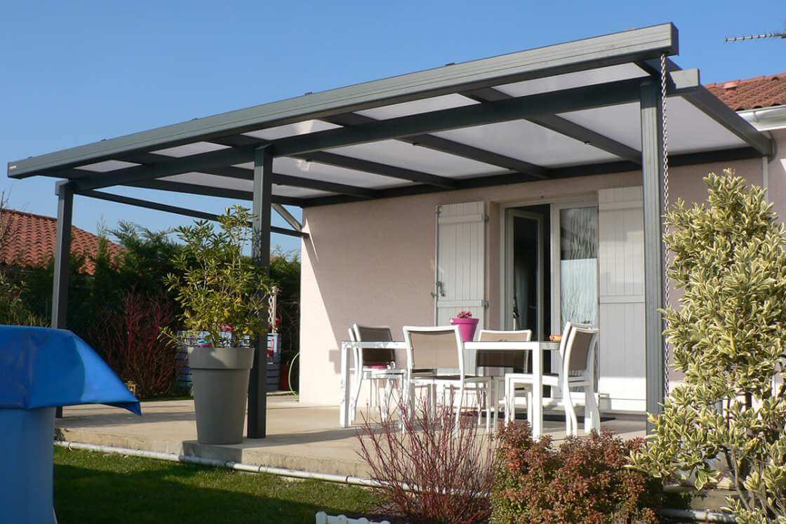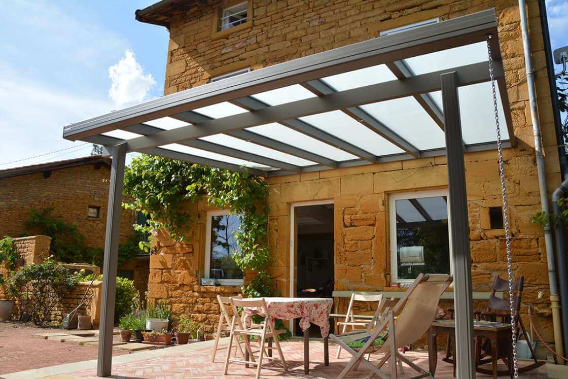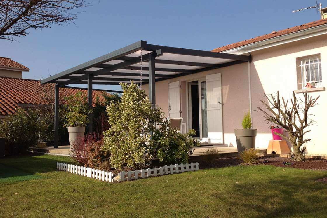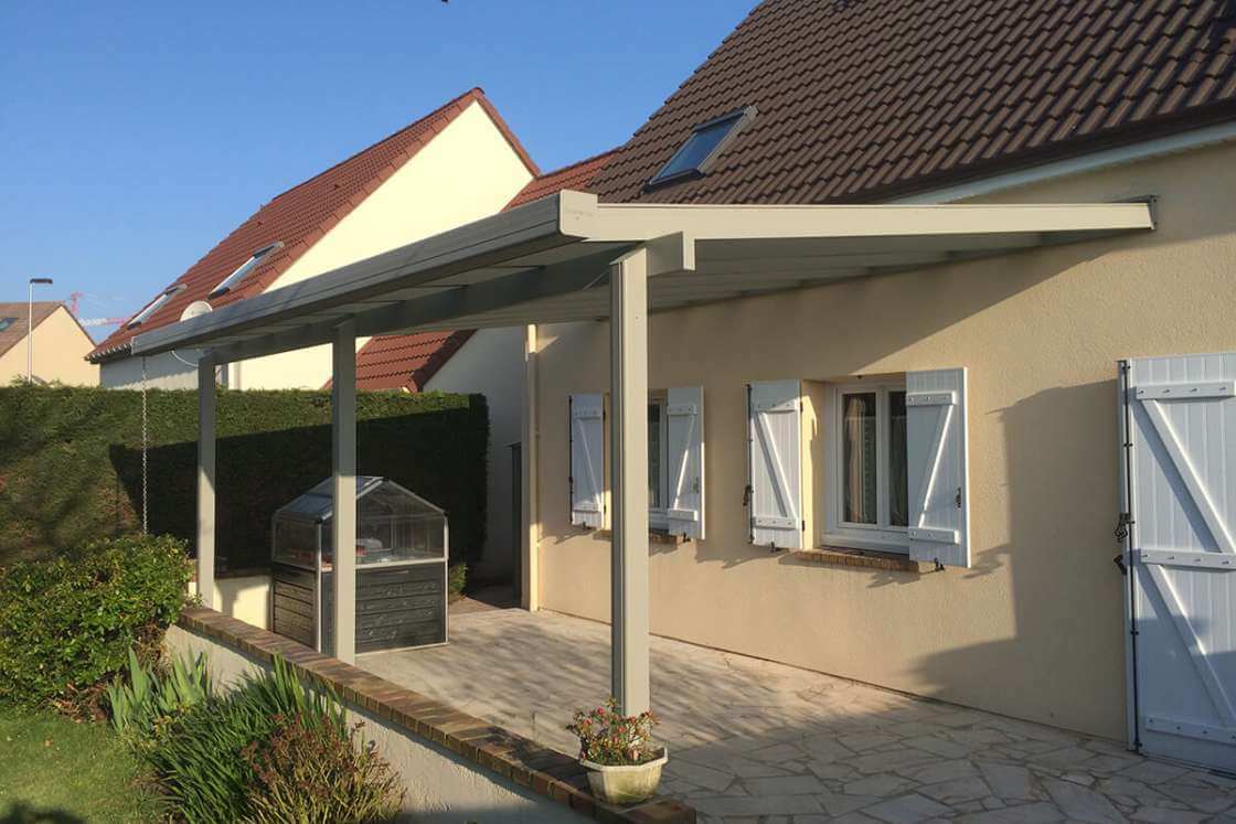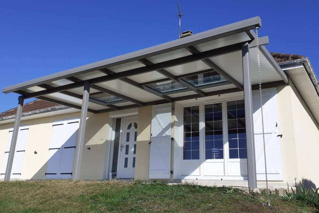 La fixation de la structure est réalisée grâce à une faîtière murale fermée sur laquelle sont fixés des chevrons tubulaires de forte section. Un système de cape en aluminium vissée renforce la solidité de l’ensemble, assurant une excellente résistance aux vents. Les plaques de toiture d’une épaisseur de 25 mm ou les vitrages feuilletés 44.2 peuvent être choisis selon vos préférences. La poutre sablière, qui soutient les chevrons, est solidement ancrée aux poteaux, offrant ainsi une stabilité accrue.