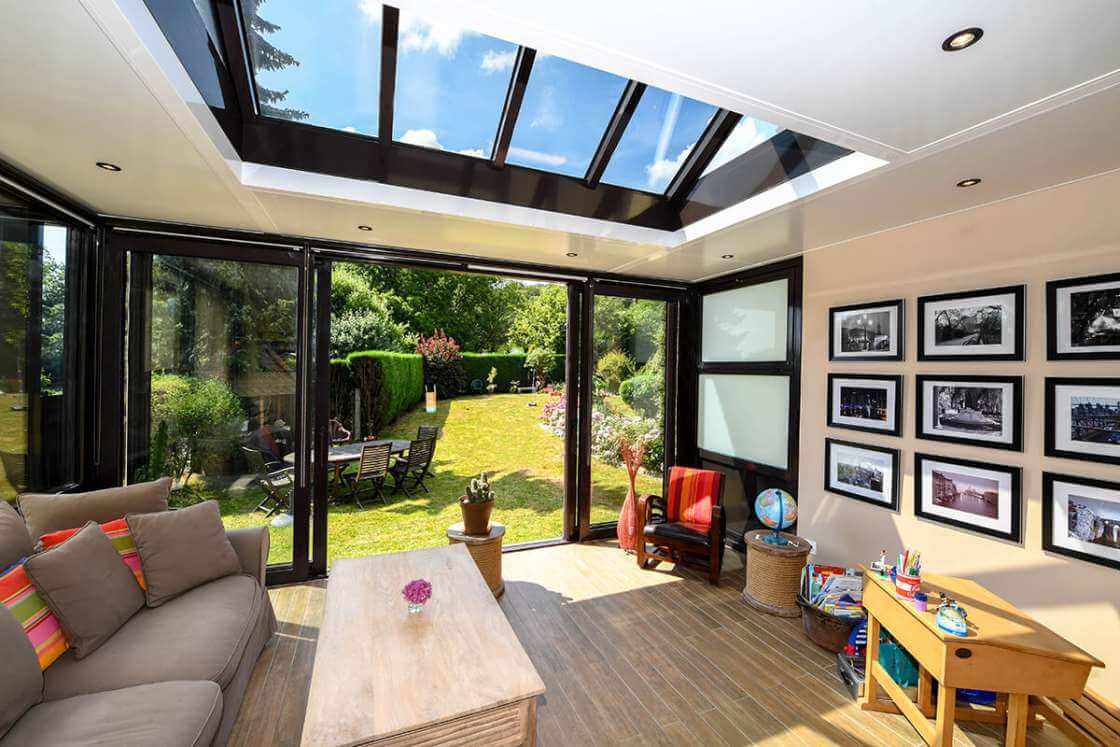 Rendez votre véranda unique avec des angles de verre verticaux sans poteau, offrant une vue panoramique exceptionnelle et une optimisation de l’espace intérieur. - Moustiquaire :